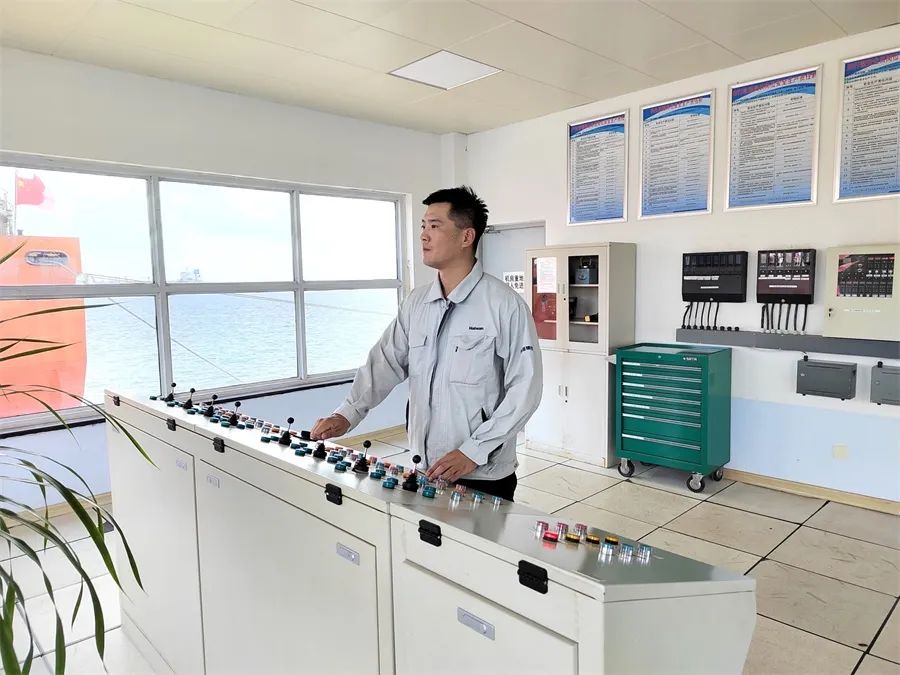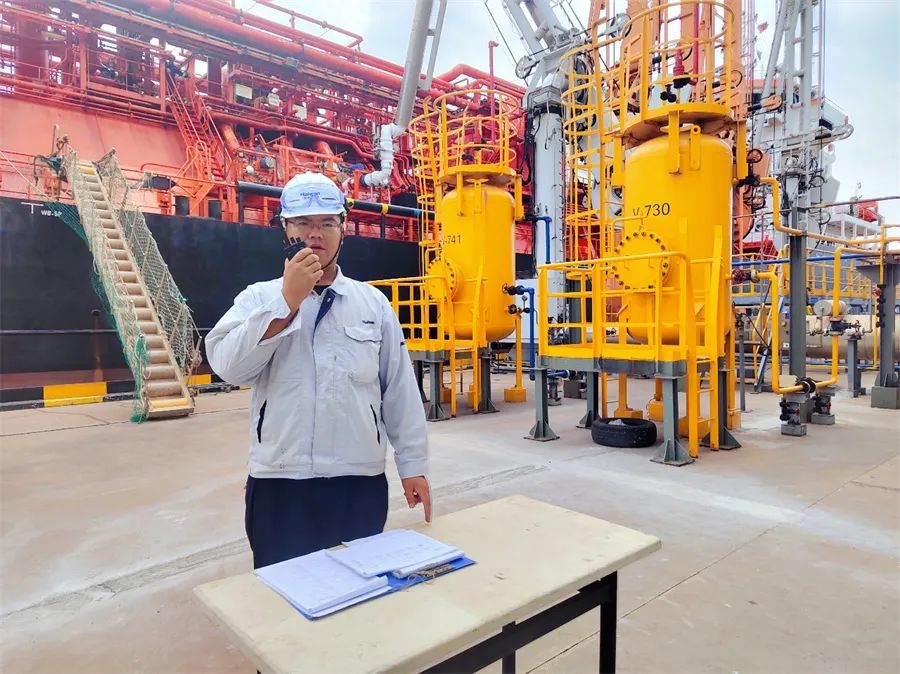 海湾港务运行三班员工做好乙烯卸船作业现场船前监护工作。潘洋洋 摄