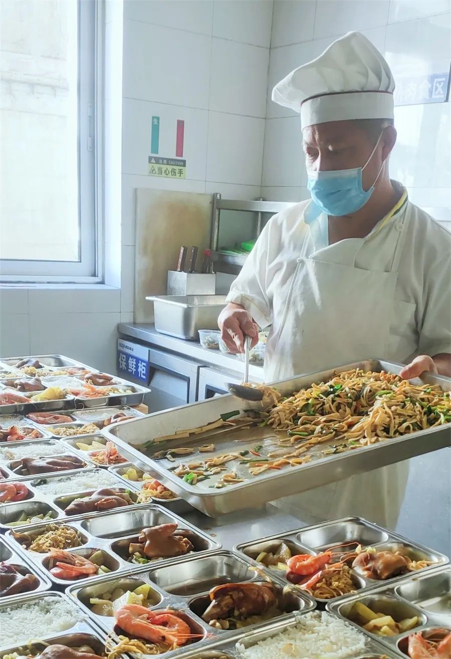 碱业发展餐厅班员工正在给三班员工分餐。于伟 摄