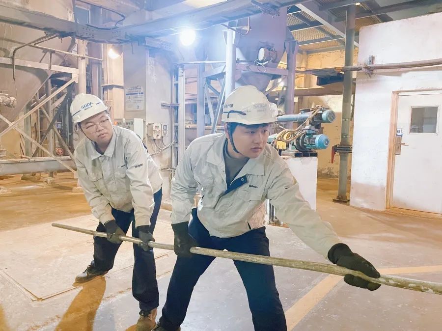 碱业发展硫酸钾厂化工乙班员工做好结块清理工作。吴宗山 摄