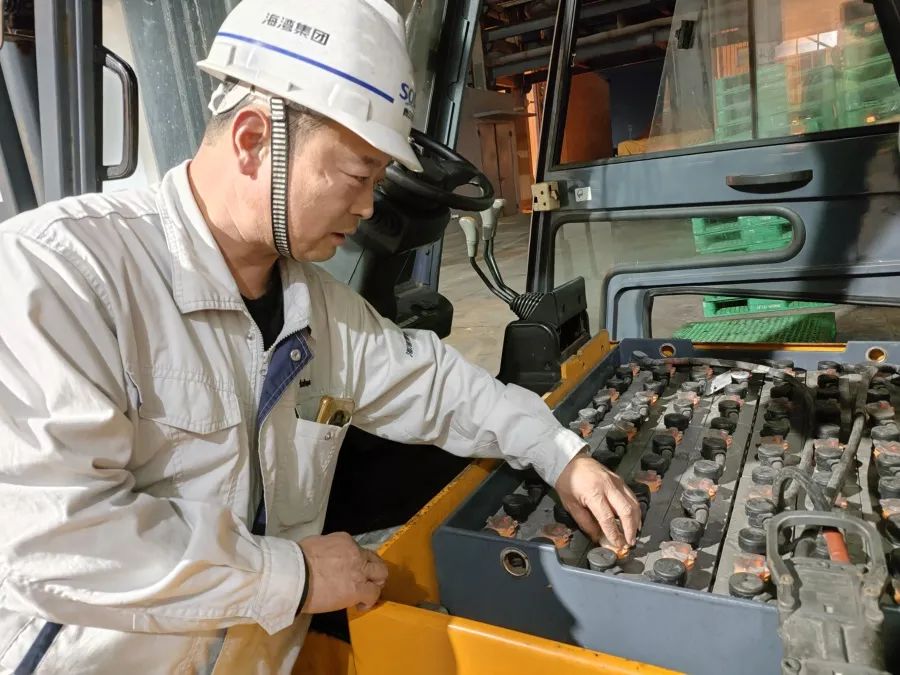 碱业发展氯化钙厂员工接班前检查叉车状况。吴学铜 摄