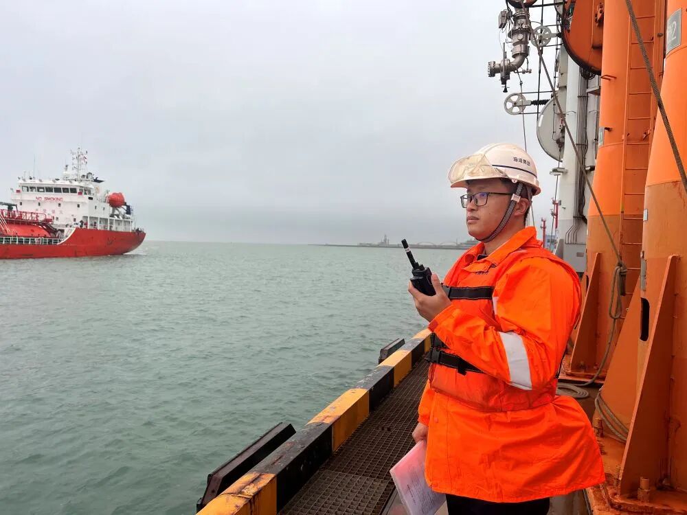 “国庆快乐!咱们抓紧时间,安全第一!”曲永泉拿起对讲机,沉稳有力的声音穿透雨声,与船方确认着最后的靠泊指令。这个假期,抵港船舶多达12条,而“华南2”轮装载的丙烯,是保障海湾化学原料供应的关键,每一秒都耽搁不起。