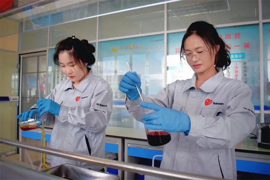 海湾精化质量控制部员工正在进行染料测色。呼扬春晖 摄