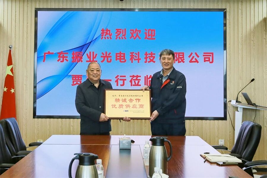10月13日,广东振业光电科技有限公司董事长贾忠惠来到海湾化学观摩,并送上一份珍贵的礼物——“精诚合作优质供应商”的奖牌。