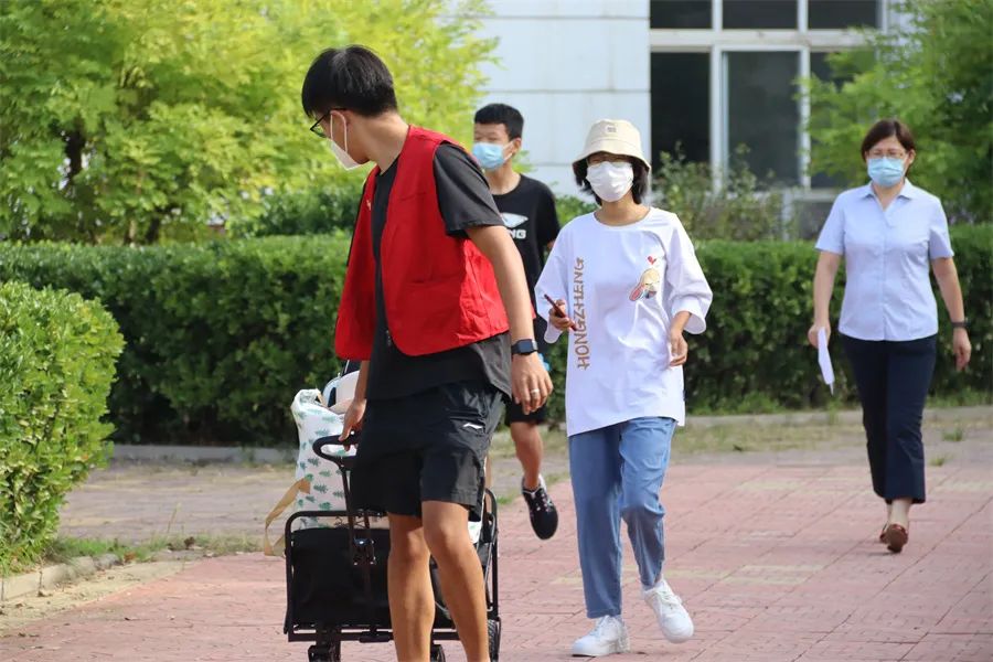 新生分三个通道进入校门,查验学生身份信息、核验、消毒、测量体温,学生们有序进入校园。校园内,志愿者们笑容满面、热情洋溢,路径指引、信息咨询、引导新生、搬运行李、分发配套物品,他们穿梭于校园各个角落,周到的服务、贴心的照顾,让新生们感受了到家的温暖。